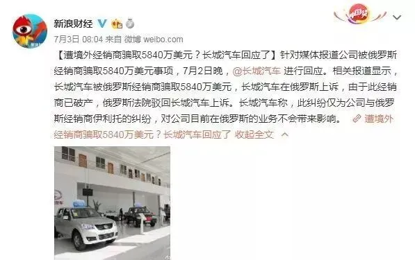 7月2日,长城汽车 “被俄罗斯经销商骗取5840万美元”的新闻引发社会关注。当日晚间,长城汽车发布澄清公告,称俄罗斯经销商伊利托集团无法按时支付车款,涉及金额约人民币3.32亿。