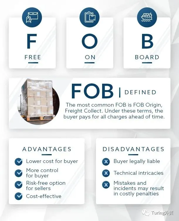 FOB是Free On Board的缩写,意为离船费用。FOB要求卖方将货物交付给买方委托的船公司,装船后的成本和风险由买方承担。