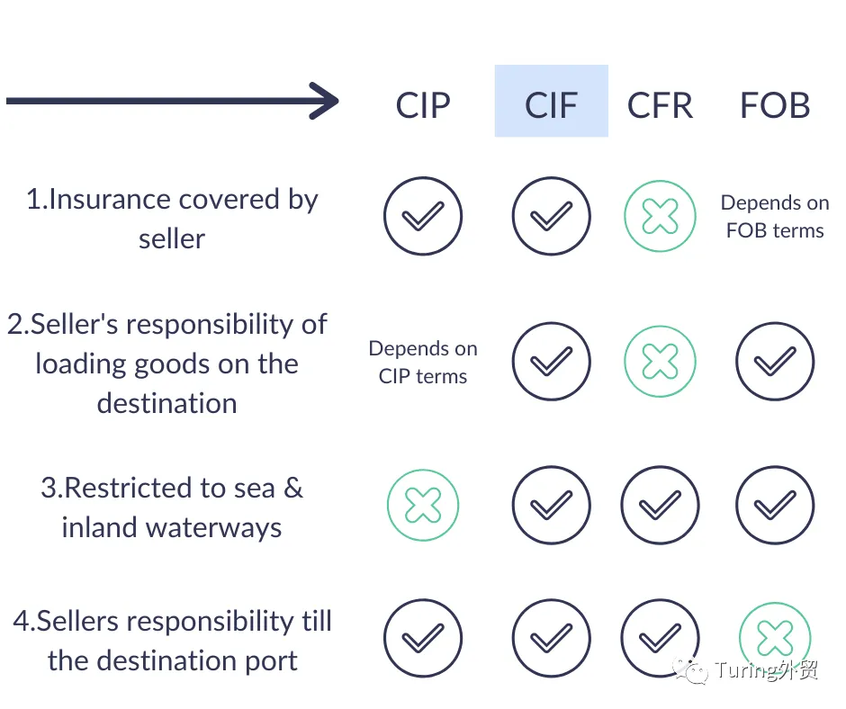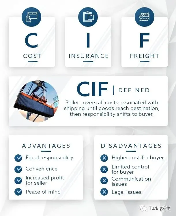 CIF条款的特点是卖方承担高额的运输成本和复杂的手续,但买方的成本和风险较低。CIF可以吸引需求便利化贸易流程的采购商。