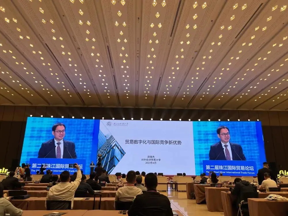 在贸易数字化创新发展论坛上,对外经济贸易大学副校长洪俊杰做了“贸易数字化与国际竞争新优势”的主题演讲。