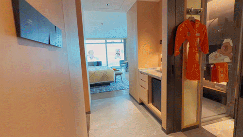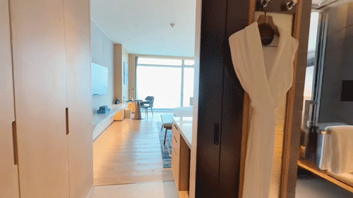 套房还配了独立衣帽间和衣物护理机,出差衣服不怕皱!卫浴也全全面升级,全景浴缸让你舒心泡澡~