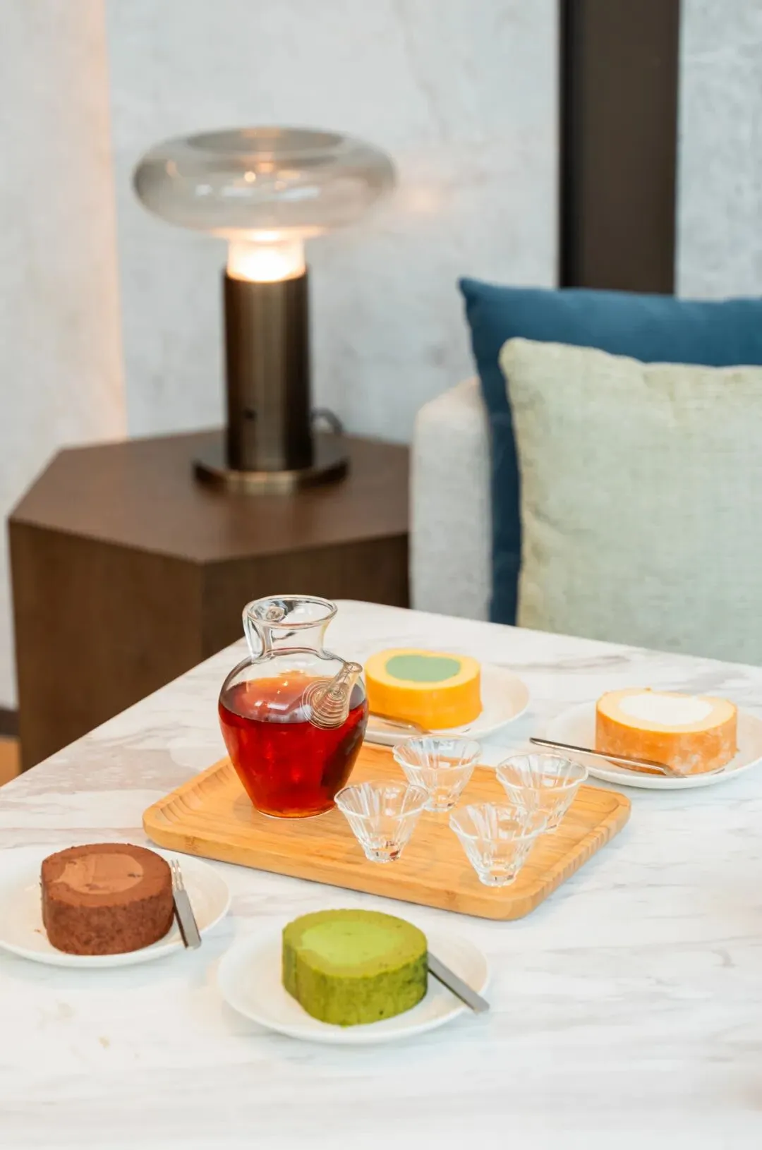 下午茶有四种不同口味的特色瑞士卷,甜点入口即化,甜而不腻,搭配万事怡人茶口感更加清新可口!