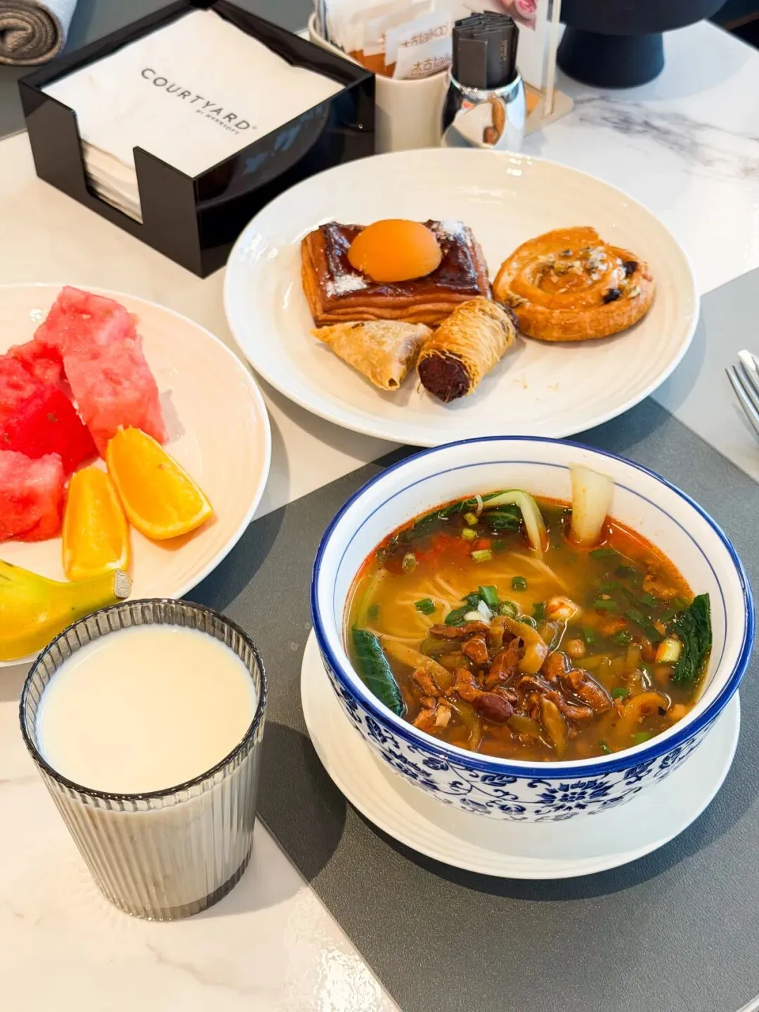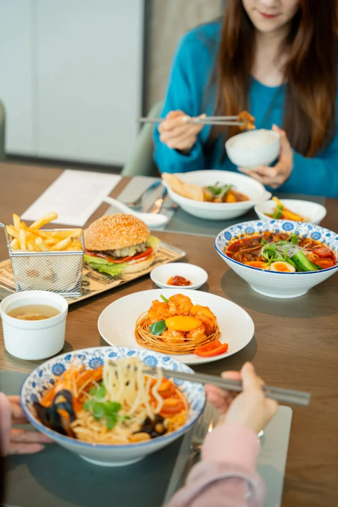 也不要错过热滚滚的汤面,泰式冬阴功海鲜面酸辣开胃,海鲜香甜可口,万怡招牌广式牛尾面还原老广地道口味,吃完直呼“返寻味”!