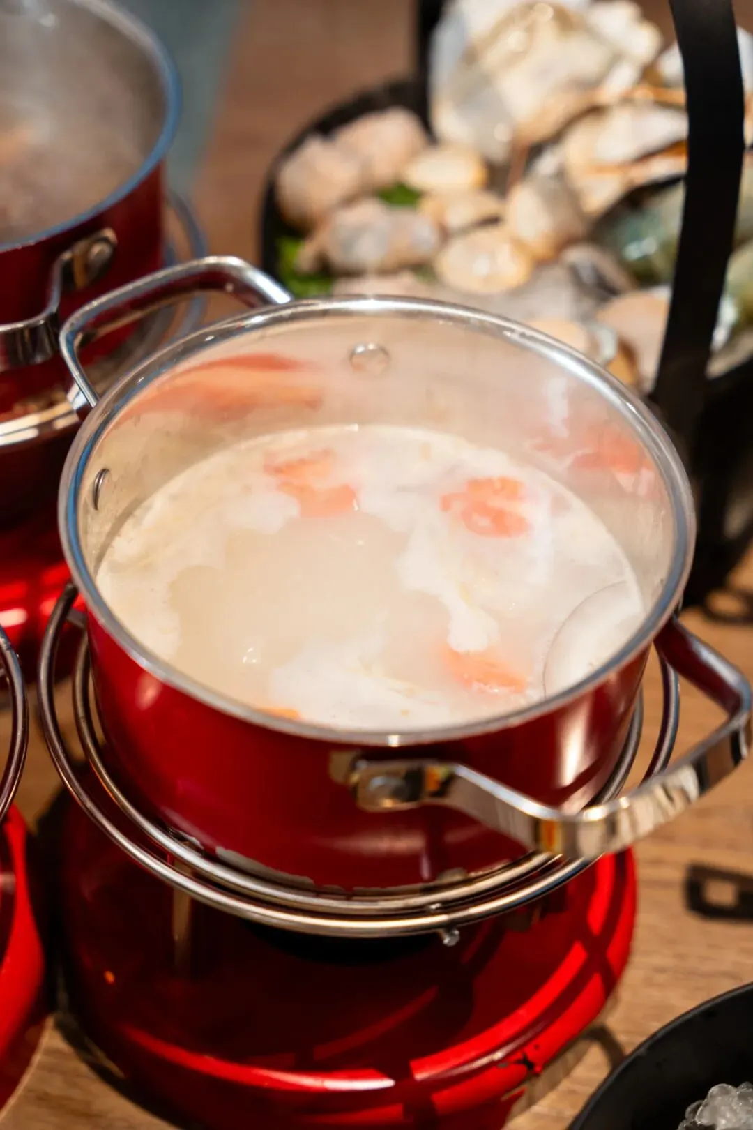 双人火锅汤底三选二,有泰式风味的冬阴功汤,鲜美的椰子鸡汤,还有鲜香十足的菌菇汤~