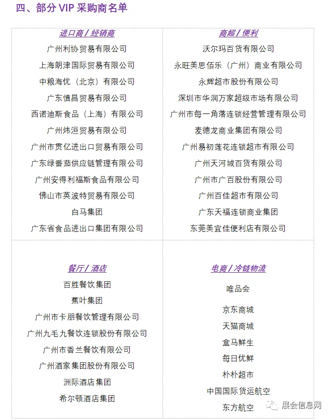 展会采购商全面覆盖全国各地进口贸易商、连锁商超、餐饮及酒店、食品批发市场、全国百强零售商、头部电商、社区电商、校园团餐联盟、个体经销商等渠道。
