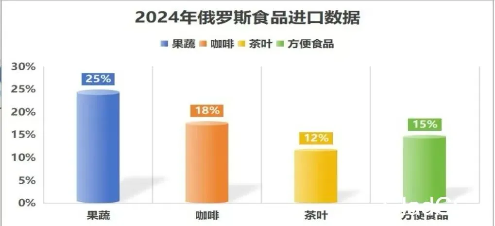 由于俄罗斯气候条件等因素影响,其食品生产主要集中在农业部门的原料生产上,如谷物、蔬菜、水果和畜禽养殖等,且进口食品数量相对较高。如热带水果、茶、咖啡、坚果等在国内无法生产的产品需要大量依赖进口。据俄罗斯联邦海关署数据,2024年俄罗斯食品进口额达320亿美元,其中果蔬、咖啡、茶叶、方便食品进口量同比分别增长25%、18%、12%、15%。