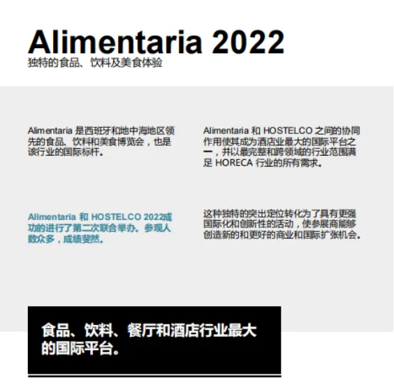 2024年,Alimentaria将继续与西班牙酒店及餐厅用品展(HOSTELCO)联手同期开展。Alimentaria和Hostelco已联合举办两届,参观人数众多,成绩斐然,同时也给予了展会一个不同的定位。两展的协同使其成为一个食品、饮料、餐厅和酒店行业的国际平台,必定为参展商创造新的商机,为国际扩张提供了重要的平台,了解市场发展趋势,定位全球市场。