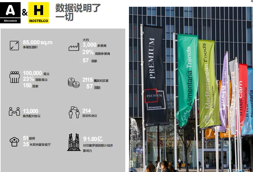 西班牙巴塞罗那国际食品饮料展Alimentaria Barcelona是全球食品行业三大展之一,首次举办于1976年。由巴塞罗那国际会展中心主办,两年一届,是西班牙及地中海地区食品、饮料及美食行业领先的展会,也是该行业的国际标杆。该展会以其明确的分区及专业高效的品质赢得了极高的国际声望,是广大食品企业打开行业新市场、投放新产品、扩充新客户、巩固老客户、进行行业交流、寻找代理商、分销商以及进出口商的专业B2B展览会。西班牙巴塞罗那国际食品饮料展Alimentaria Barcelona按照产品的种类及来源分为15个独立的展示区,以促进其参与者之间的商业交流,并为专业买家和观众节省拜访时间,大大提高了展商的参展回报率。