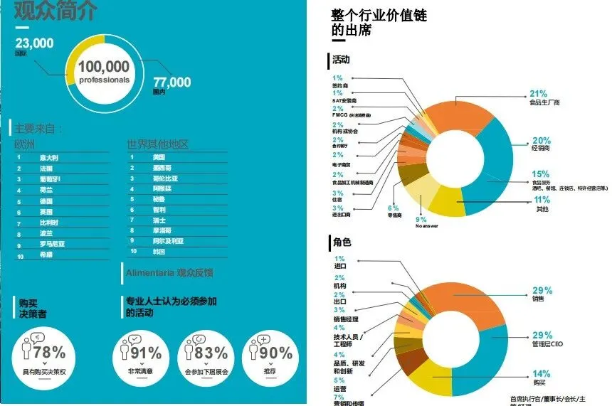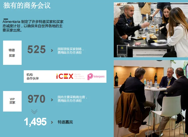 在过去的几十届展会里,Alimentaria建立了良好声望:78%的观众具有购买决策权,91%的观众对展会感到非常满意,并且有83%的观众表示会继续参加下一届展会。参展商认为Alimentaria是打开食品行业新市场的重要展会,是投放新产品,实现新订单,扩充新客户,巩固老客户,寻找代理商,分销商以及进出口商的完美场所。参展商可以通过参加Alimentaria在业界树立企业形象,是在同行业内展示企业风采的理想时机。在展会现场,参展商可以了解市场信息及行业发展趋势,分析竞争对手,与全球专业观众建立商业往来。