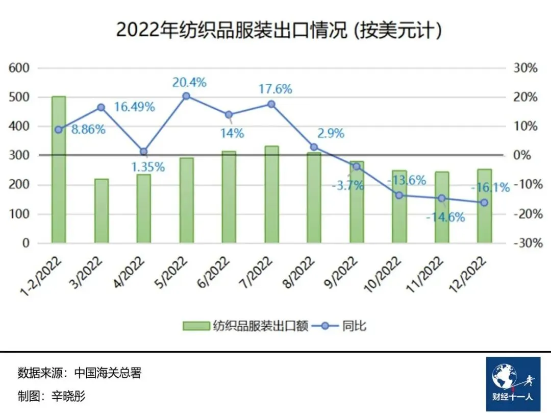成本上升是阻碍盈利的一大因素。上游端,2022年原材料价格高企的现状仍然延续,春节后棉价继续走高。“(2022年)10月出口额大幅下降——这还只是金额,原材料涨价了,数量上下降更多。”产业分析师杨庆生告诉记者,2022年很多中小企业都是让利出货。