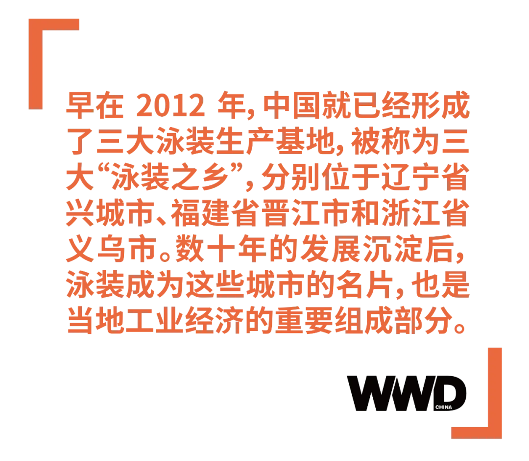 过去很长时间,中国泳装一直呈现出高度城市集群化的特征。早在 2012 年,中国就已经形成了三大泳装生产基地,被称为三大“泳装之乡”,分别位于辽宁省兴城市、福建省晋江市和浙江省义乌市。数十年的发展沉淀后,泳装成为这些城市的名片,也是当地工业经济的重要组成部分。