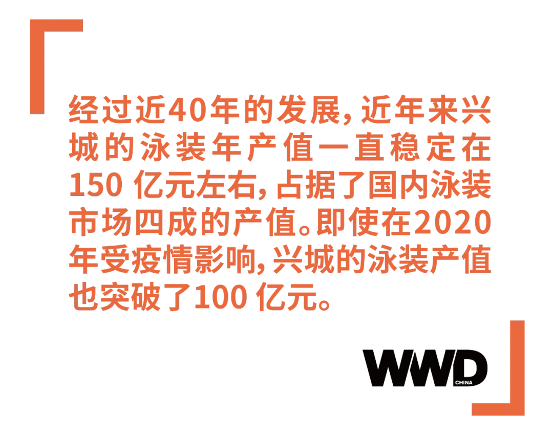 从无到有、从小到大,经过近 40 年的发展,近年来兴城的泳装年产值一直稳定在 150 亿元左右,占据了国内泳装市场四成的产值。即使在 2020 年受疫情影响,兴城的泳装产值也突破了 100 亿元。