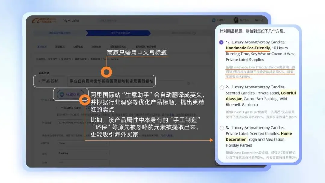 因为他开始向智能外贸生意助手借力。上新商品时,于洋只要在后台输入一个中文产品名称,点击“标题优化”后,生意助手会结合平台上的商品特性和搜索热词,立即给出多个更具卖点的英文关键词与标题参考。
