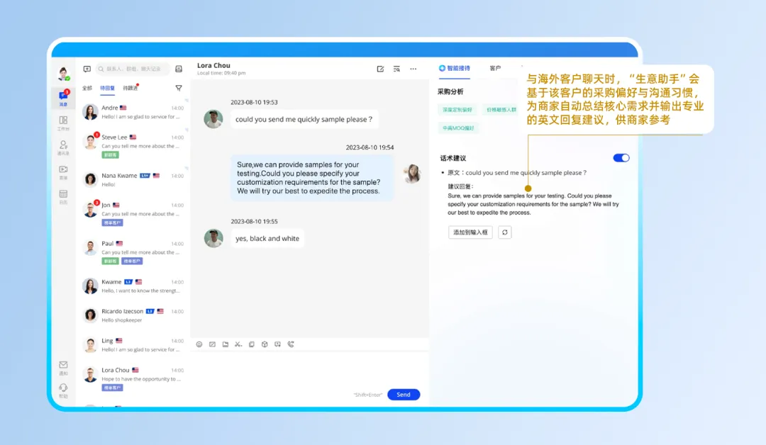 此次AI在外贸行业的落地,可以替代传统人力完成大量数据分析、客商个性分析、文案和话术拟定、多语翻译等方面工作,辅助商家决策,让其更专注聚力在专业的生产板块,同时为更多寻求业务扩大盘的中小商家找到市场的确定性方向。