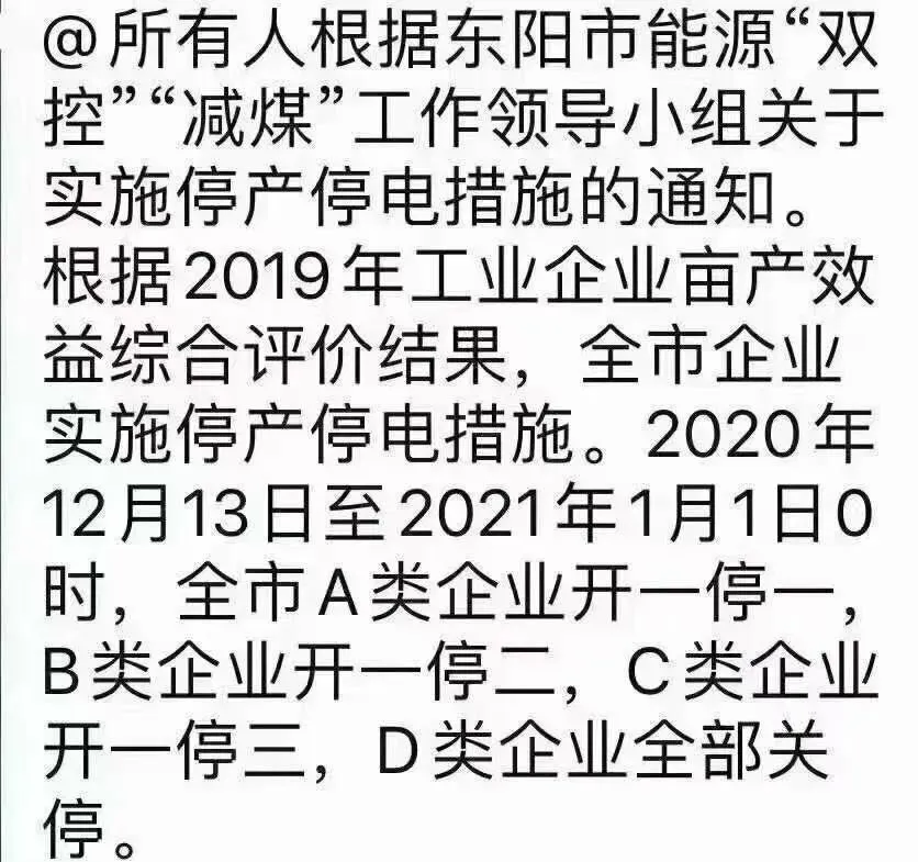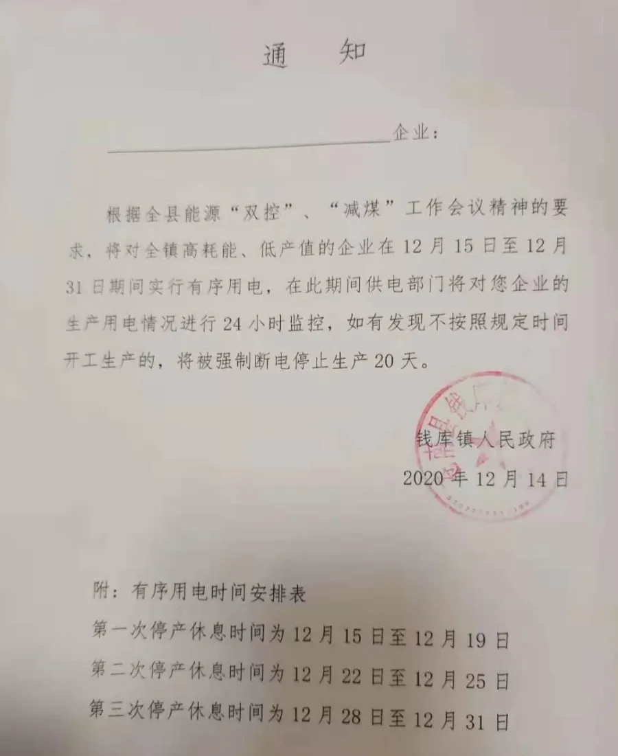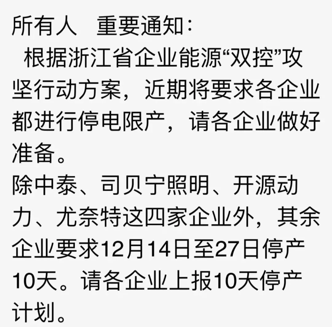 大部分浙江外贸工厂均已收到“停电限产”的通知,温州钱库镇某供应商晒出通知,通知显示:根据全县能源“双控”、“减煤”工作会议精神的要求,将对全镇高耗能、低产值的企业将在12月15日至12月31日期间实行有序用电,在此期间供电部门将对您的企业生产用电情况进行24小时监控,如有发现不按规定开工生产的,将被强制断电停止生产20天。