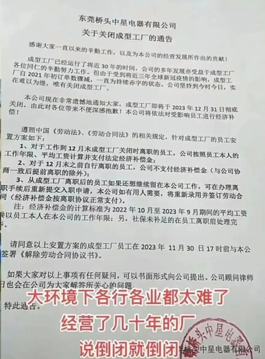 2023年11月7日,位于东莞市桥头镇日资中星电器有限公司旗下成型工厂宣布将在年底彻底关闭。