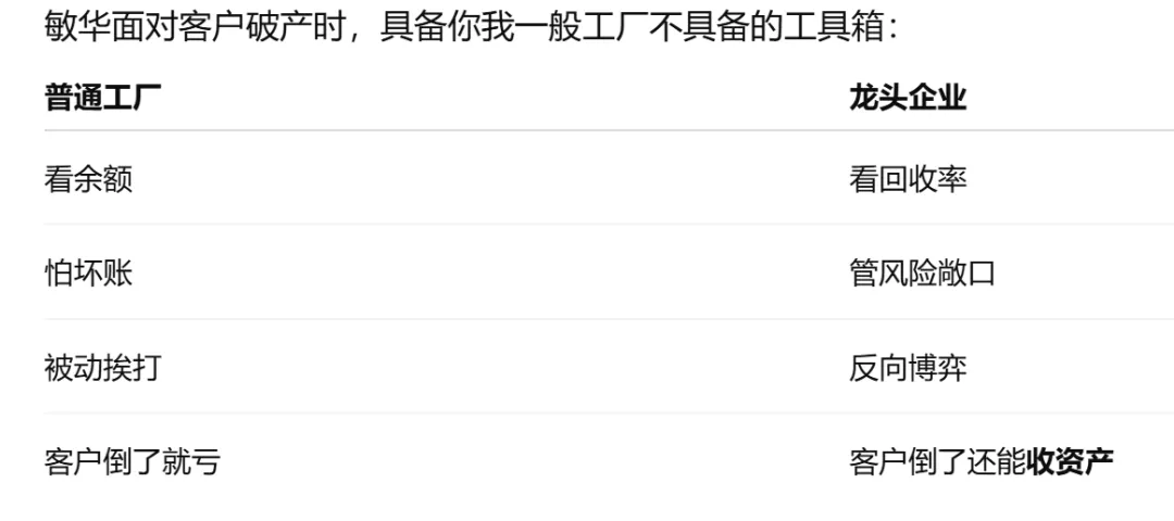 也就是说:我们看到的“欠款金额”是债权申报/债权人名单数字,不等于敏华最后“净损失”数字。它可能被部分回收,也可能被保险覆盖一部分,也可能以前年度已经谨慎计提过。(大公司的财务系统果然厉害)。龙头企业可能会有客户倒闭货款被清算的风险,同时, 也有在资产在行业低迷期以更便宜价格,趁周期底部做大并购。