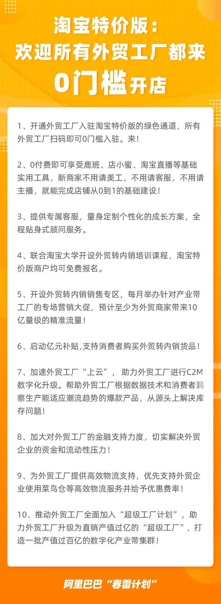作为产业带工厂最重要的内销平台,淘宝特价版在4月14日公布支持外贸工厂转内销的十项措施:欢迎外贸工厂“0门槛”入驻,并给予10亿量级的流量支持,给外贸工厂打开更大内销空间!同时,联合淘宝大学在线学习平台,开设外贸转内销培训课程,淘宝特价版商户均可免费报名。这是阿里巴巴“春雷计划”的一部分,也是全网首个针对外贸工厂转内销的系统扶持举措。淘宝特价版将上线外贸工厂销售专区,每月针对产业带工厂组织专场大促,预计将为外贸商家带来10亿量级的精准流量。同时,淘宝特价版还将启动亿元补贴,直接支持消费者购买外贸转内销货品。淘宝特价版是全球首款以C2M为核心供给的购物软件。淘宝C2M事业部,将建立帮助外贸工厂转内销的长效机制。淘宝C2M事业部产业带运营总经理靳科表示,对外贸商家的支持不只是“授人以鱼”的卖货,更是要“授人以渔”,培育商家的数字化能力,让他们能够适应国内市场,生产最适销对路的商品。淘宝特价版将全力支持外贸工厂“上云”,进行C2M数字化升级,根据消费者洞察反向定制生产爆款商品。同时,依托阿里经济体的生态力量,外贸工厂上淘宝特价版,还将享受到来自网商银行、菜鸟网络等提供的高效金融、物流服务,解决疫情期间经营的后顾之忧。