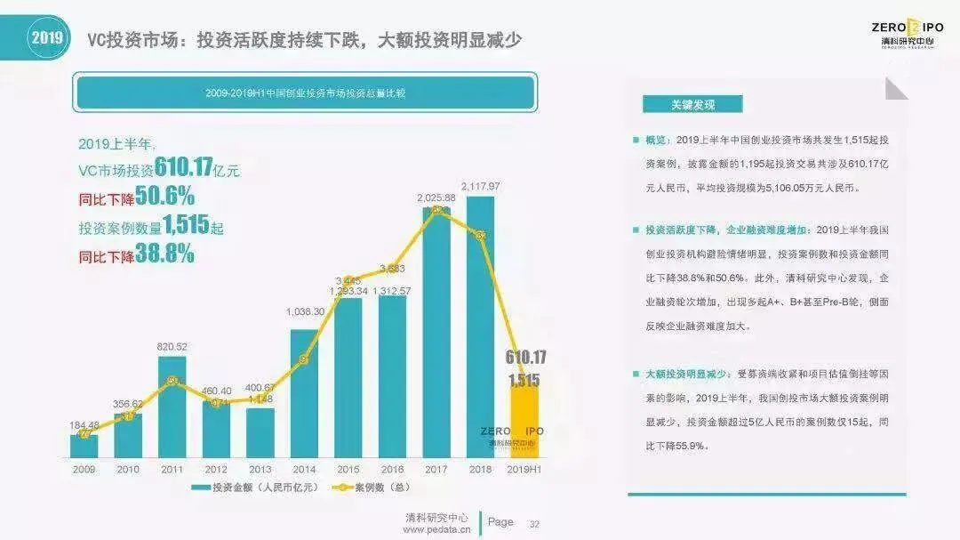 这一切,从VC机构募资就看出端倪。清科研究中心数据显示,2019上半年VC市场募资893.27亿元,同比下降49.6%,堪称腰斩;