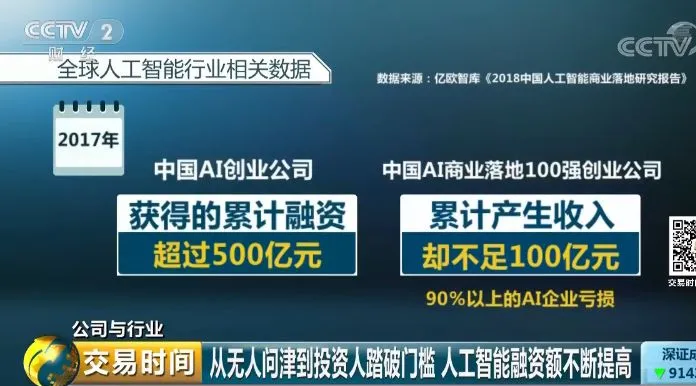 但不少业内人士也担心,人工智能领域存在巨大的泡沫,或将迎来一波倒闭潮。根据亿欧智库《2018中国人工智能商业落地研究报告》,2017年中国人工智能创业公司获得的累计融资超过500亿元,但2017年中国人工智能商业落地100强创业公司累计产生的收入却不足100亿元,90%以上的人工智能企业亏损。