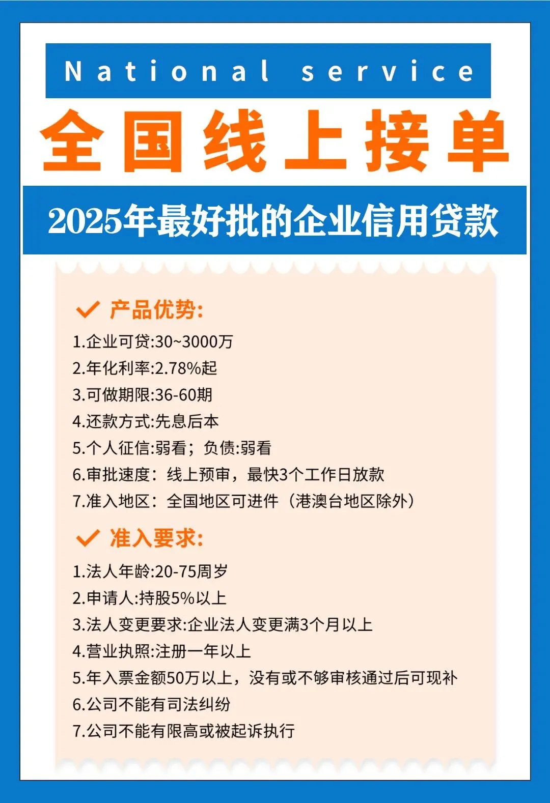 做企业最痛的是什么?不是缺订单,不是缺市场,而是关键时刻缺资金!眼看旺季备货差钱、设备升级缺钱、拓展市场没钱,传统融资却门槛高筑:要抵押、要担保、材料堆成山,审批一等就是一个月,商机早就溜走。现在重磅利好砸来——企业融资门槛直降到底!仅凭一张合法有效的营业执照,就能轻松撬动150-1200万大额资金,审批快、额度高,彻底解决企业资金周转难题,助力腾飞无忧!