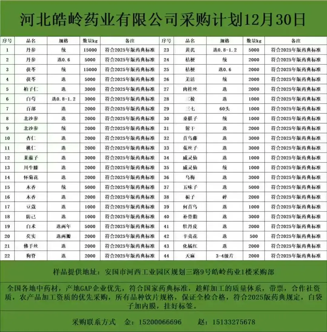 河北皓岭药业有限公司计划采购37个品种:丹参、茯苓、柏子仁、白芍、百部、北沙参、桃仁、莱菔子、川牛膝、野菊花、木香、豆蔻、薏苡仁、白术、芡实、佛手丝、狗脊、黄芪、桔梗、羌活、肉桂、三棱、三七、桑椹子、射干、白蒺藜、菟丝子、威灵仙、乌梅、五味子、栀子、补骨脂、何首乌、牡丹皮、辛夷花、化橘红、天麻金:15200066696