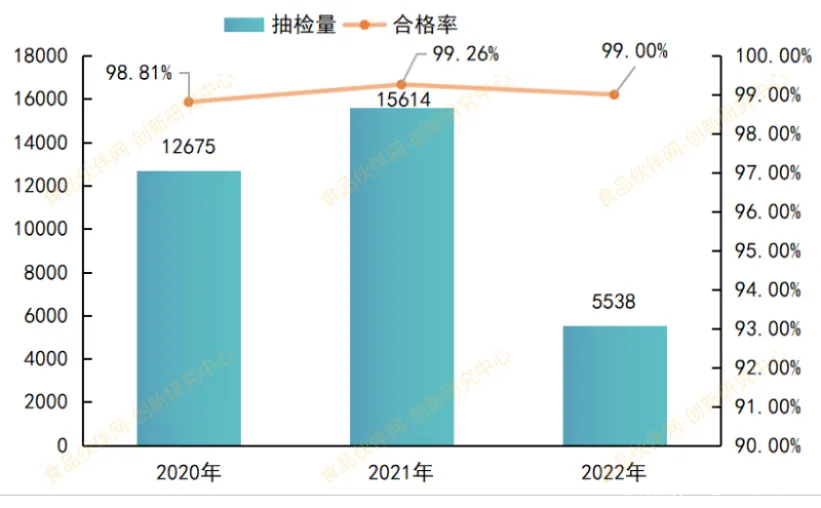 从抽检合格率来看,特殊医学用途配方食品的合格率最高,为100%;其次是运动饮料,共计抽检1621批次,不合格数量为5批次,合格率为99.69%,不合格原因为违规使用胭脂红及其铝色淀、标签不规范和违规使用苯甲酸及其钠盐;保健食品抽检22379批次,不合格数量为113批次,合格率为99.50%,主要不合格原因为质量指标不合格、微生物超标和污染物超标。