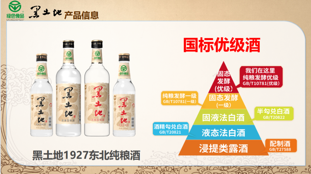 黑土地作为东北酒第一个走出东北成为全国化的品牌,旗下黑土地1927系列光瓶酒都是以GB/T10781.1(优级)为执行标准,致力于品质上的不断提升,追求工艺上的精益求精,不断突破。