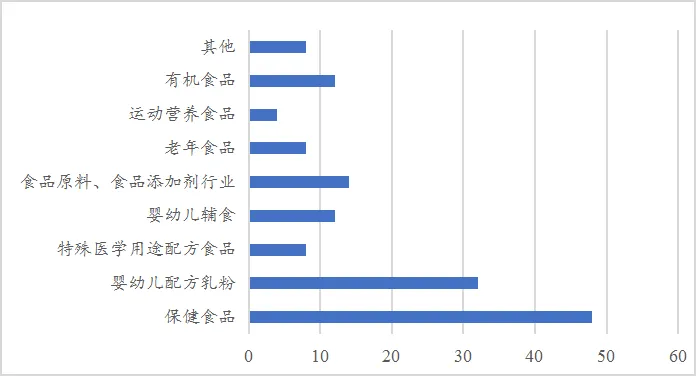 参与访谈的企业中48.84%为民营成品生产企业(图六),产品除普通食品外,以保健食品和婴幼儿配方乳粉为主,分别占比55.8%和37.2%(图七)。