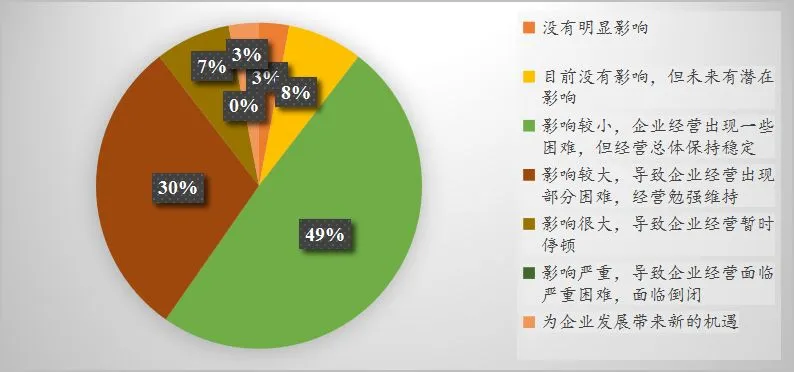 一是疫情冲击相对较小,复工复产存在一定的困难。此次新冠肺炎疫情对食品行业的冲击较大,对线下零售企业、餐饮企业以及初创企业尤为明显,现金流锐减、交通阻滞、开工延迟等问题,使他们备受煎熬,甚至面临倒闭。比较而言,49%的调查企业认为特殊食品行业受冲击相对较小,30%的企业认为影响较大,经营勉强维持,同时3%的企业认为本次疫情为企业的发展带来新机遇(图八)。
