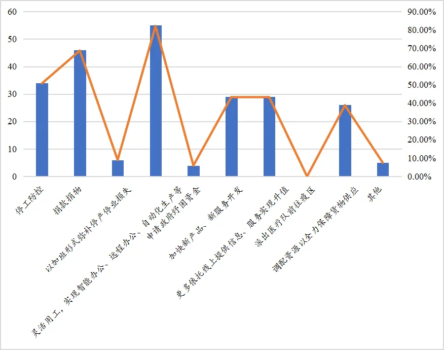 面对疫情,特殊食品企业首先通过自救应对疫情的挑战。调查显示,82%的企业灵活用工,采用智能办公、远程办公、自动化生产等,保障企业正常运转;68%的企业尽己所能通过捐赠的方式驰援灾区;50%的企业选择停工防控,待政府发布恢复生产的通知后再复工复产;43%的企业利用防控阶段加快新产品、新服务的开发,待疫情解除后加快修复工作;38%的企业面对疫情通过调配资源以全力保障货物供应。访谈中,很多企业希望监管部门可以统一发布指导原则进行监督指导,能够让企业客观正确对待新冠肺炎疫情防控,安全规范生产。