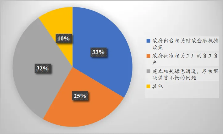 问卷调查显示,面对疫情期间企业的客观实际困难,企业希望从财政金融扶持(33%)、建立货物运输绿色通道(32%)等方面支持企业复工复产(图九)。疫情期间企业办理行政审评审批事务受到影响,部分企业资质证书的受理有效期即将到期,因此希望优化相关行政审批工作。同时,也希望针对物资运输、人员流动环节等疫情防控重点环节出台防护保障措施,特别是协调相关部门针对物流等领域开辟“绿色通道”,保障企业复产员工返岗、原材料供给及成品运输等需求,降低疫情防控对复工复产带来的影响。