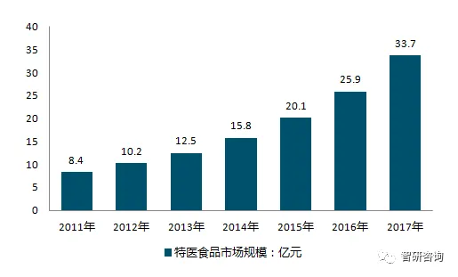 特殊医学用途配方食品,简称医用食品,是为了满足进食受限、消化吸收障碍、代谢紊乱或特定疾病状态人群对营养素或膳食的特殊需要,专门加工配制而成的配方食品。 是不同于普通食品、保健品和药品的新型产品,是需要特殊食物管理的患者在医生指导下进行服用的一类具有特殊食物用途的食品。2017年中国特医食品行业规模达到33.7亿元,较2016年同期增长30.12%。