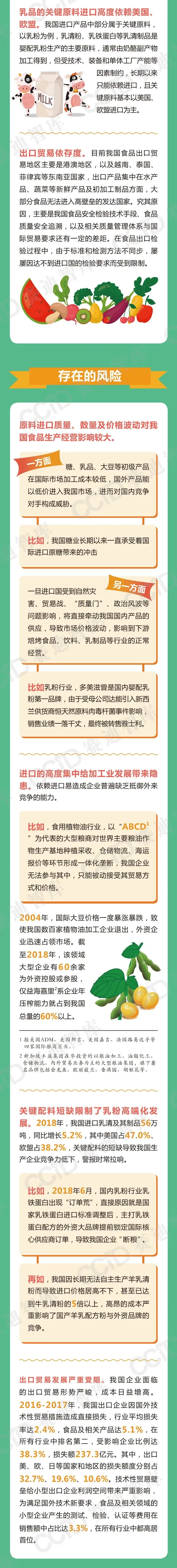近年来,全球食品贸易额年增速基本在 7%-9%之间,在总商品贸易中的地位稳步提升,但贸易局势的复杂性和不稳定性一直存在。目前,我国部分食品细分行业贸易结构不尽合理,在原料、关键配料、产成品进出口方面,对以美国为代表的西方国家依存度较高,与贸易摩擦所带来的较为集中的短期经济效应和贸易替代相比,这些问题对产业发展的长期制约和影响更大,亟需认真审视分析,增强风险防范能力,促进行业持续健康发展。