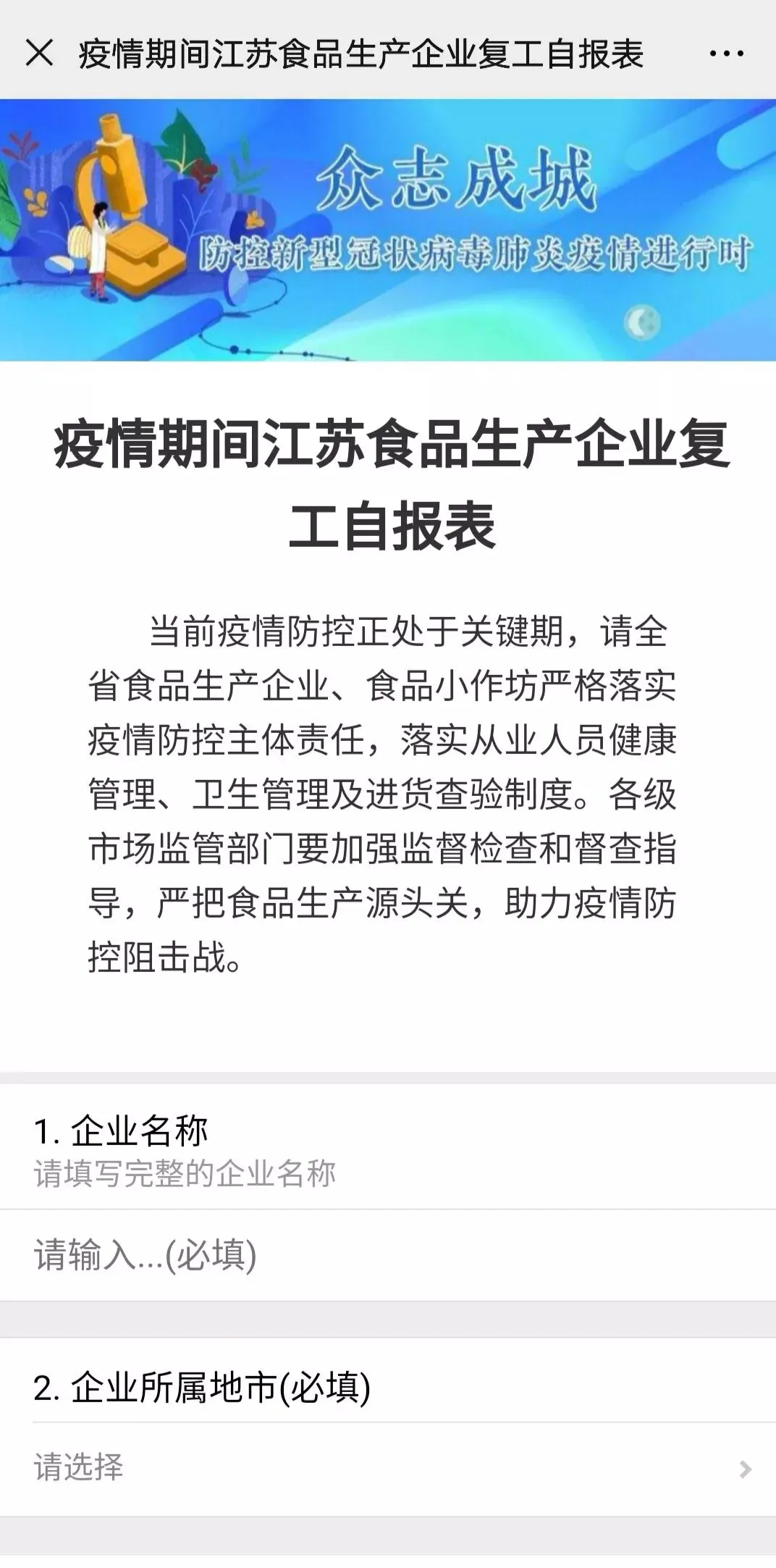 为了解疫情防控期间全省食品生产企业基本情况,近日,江苏省市场监管局推出“疫情防控期间食品生产企业状况自报”微信小程序,确保食品生产安全监管工作和疫情防控工作有效开展。