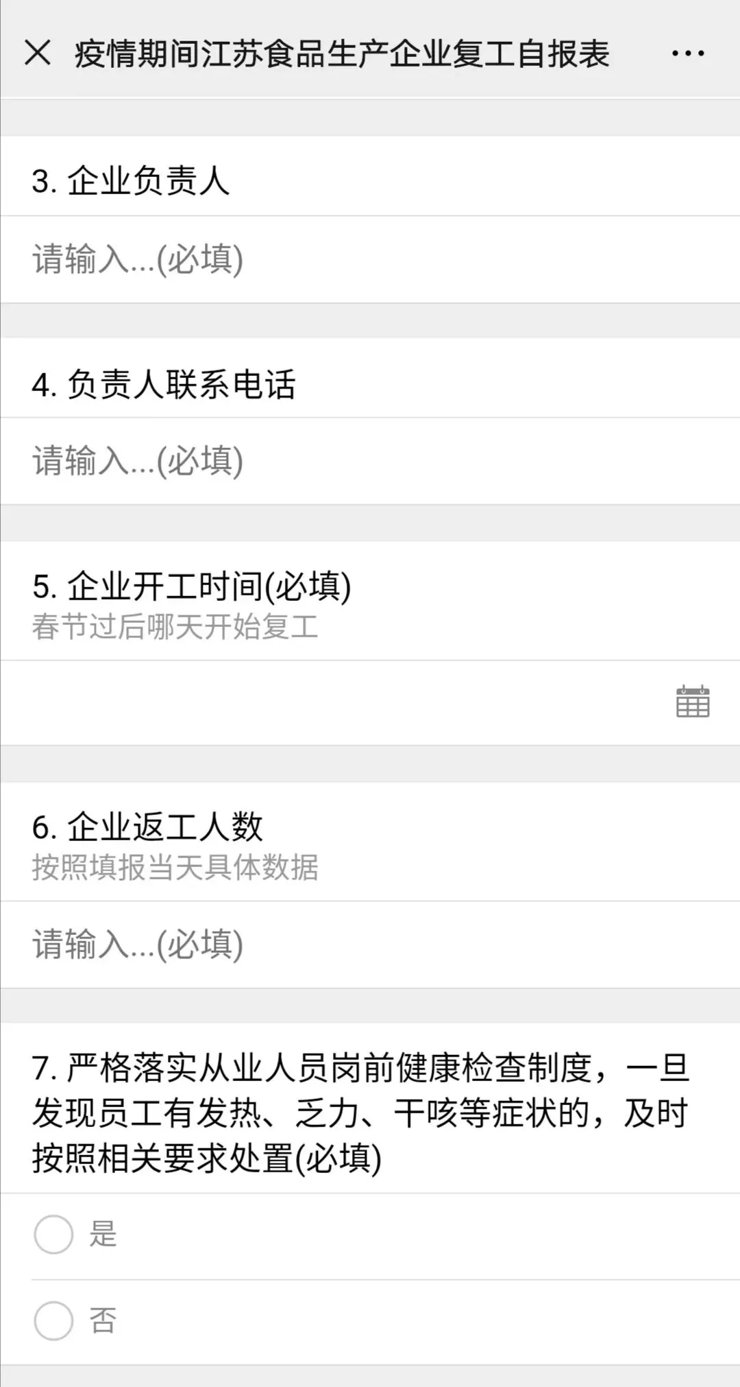 企业复工应具备疫情防控条件,落实好相关防控措施,并符合当地政府的防疫规定。全省食品生产企业经当地政府同意复工后,可以通过该小程序报告复工和返工人数情况。企业只需通过微信扫描二维码的方式,一次性填报企业名称、所属地市、企业负责人、联系电话、开工时间、返工人数、岗前健康检查等相关信息即可。