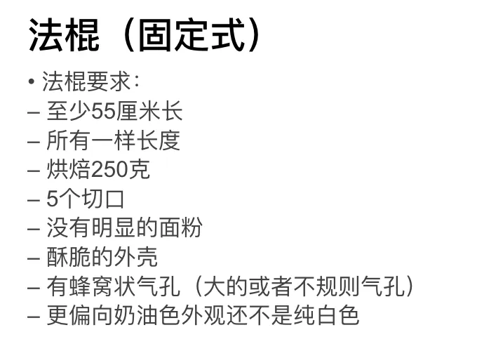 不愧是世界级的顶尖赛事,一组比赛就长达9个小时(前一天准备1小时,当天操作8小时)。光是这个强度和压力,已经是对选手身心的双重考验。评判规则也是细致又严格……来看看最基础款的法棍,就有这么多要点?