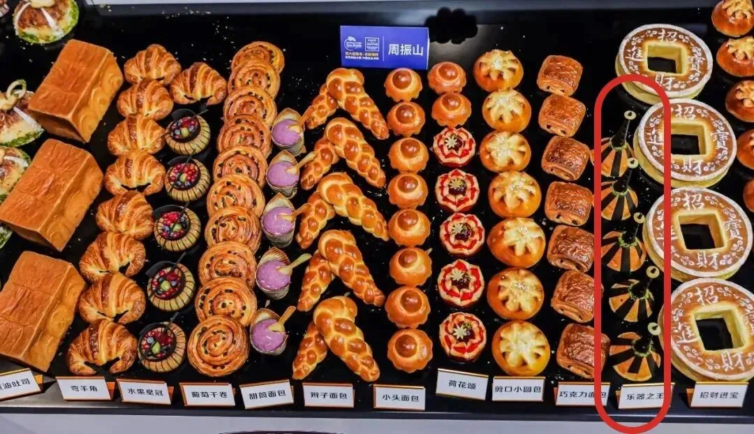 图源@乐斯福羊角丹麦&花式甜面包冠军是周振山。他选择的馅料很丰富,同时又有出挑的产品设计。比如乐器之王这款面包,本身就造型独特,还加入了巧克力,制作难度翻倍,属于蛮炫技的作品。