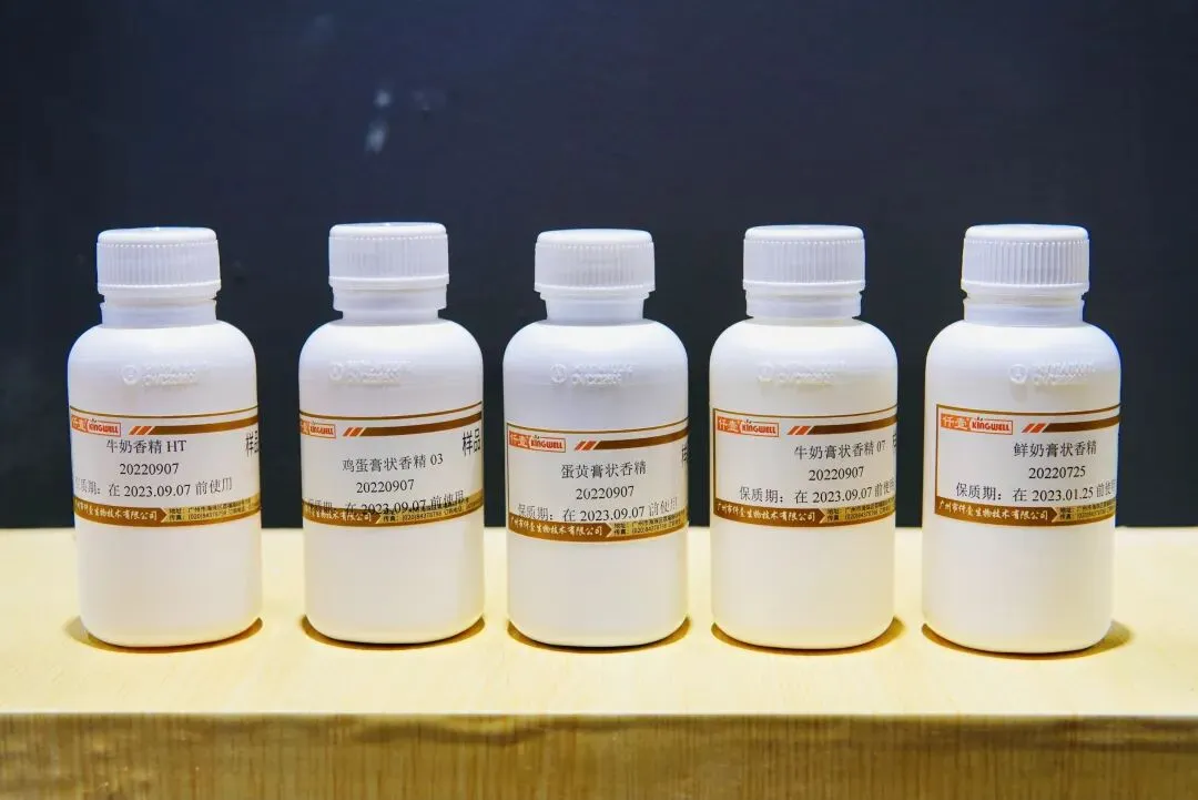 而且很友好地减了糖,用在甜品制作上更方便控制甜度啦。还尝到了一款超细研磨的蓝莓冻干粉,在口腔里几乎感受不到粉末的存在,做甜品直接拌进奶油里,不用引入水分,也不会有粉感!就连面包馅里的卡仕达酱,都研发了更有“爆款潜力”的宫保鸡丁、灯影牛肉风味,不过配料表并没有鸡肉、牛肉啦;)奶味香精也越来越精细了,有牛奶、鲜奶、北海道牛奶等好几种。不管想要旺仔牛奶那种焦糖奶香,还是新鲜日本牛奶的奶香,都能满足。