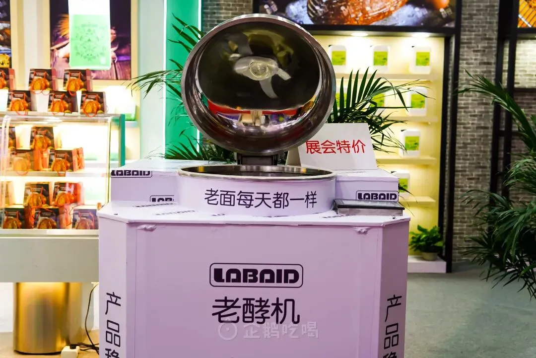 这些展位上的人也是真的多,所以说要珍惜愿意从面粉开始做烘焙的店家……想让面包更湿润柔软,以前要辛辛苦苦制作汤种,现在靠酱料挤一挤就搞定。?汤种法是指,用65度热水糊化面团冷藏一夜,再加入到主面团里,提升面包的保水性和柔软性。研究了一下配料表,思路是直接把糊化的面粉糊做成酱,还加入了乳清粉、乳清蛋白粉,增加面团蛋白质含量,提高面包吸水性,考虑得很全面了!还有现在面包手作圈流行养的天然酵母,已经有工业化的鲁邦种、风味面包液替代品,能跳过自养酵母的步骤,直接用于发酵。展商还把老酵机搬过来镇场,机器能根据酵母活性调节内部的湿度、温度。(PS:大家觉得“每天都一样”的天然酵母,还能叫天然酵母吗?)