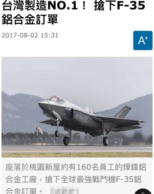 之前,台湾媒体就曾经宣扬“台湾制造NO.1,抢下F-35铝合金订单”,抢了一个战机制造的原材料订单就可以宣传台湾制造NO.1?这自我感觉太良好了吧?估计湾湾肯定会骄傲地对其他人说:“,我跟你讲哦,美国这个F35哦,没有我们台湾他们造不出来!”嗯,湾湾靠嘴炮改变世界、点亮台湾……