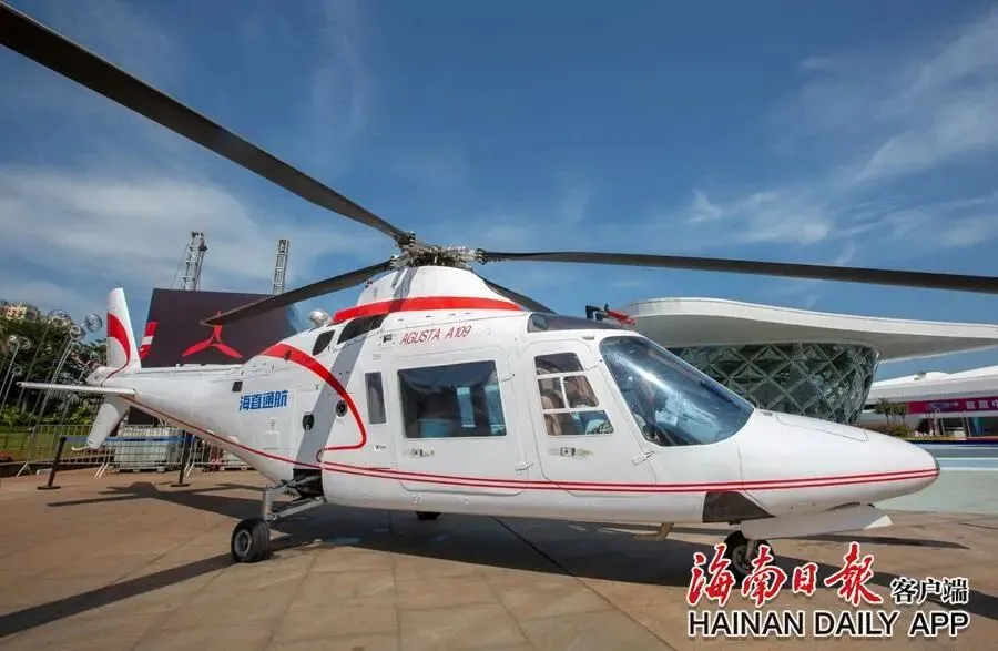 2021年5月4日,在海南国际会展中心,参加首届中国国际消费品博览会的直升飞机停在广场上。海南日报记者 袁琛 摄