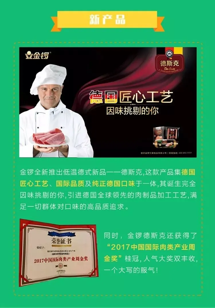 而唇齿留香,令人回味无穷的德式新品也不负众望,凭借德国匠心工艺、国际品质及纯正德国口味,满足了吃货们挑剔的肉食需求,成功斩获“2017中国国际肉类产业周金奖”,厉害了WORD金锣。