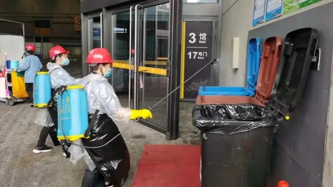 国家会展中心还出动了20余人的后勤队伍,每天实施消杀工作。上午开展前,进行全场消杀,晚上闭馆后,再进行雾化喷杀。洗手间、电梯厅等场所,也不间断擦拭消毒,餐饮区在10时和14时30分,分别进行两次消毒。