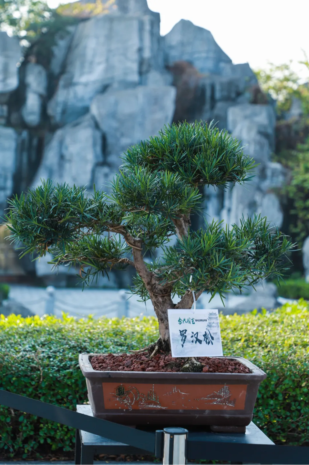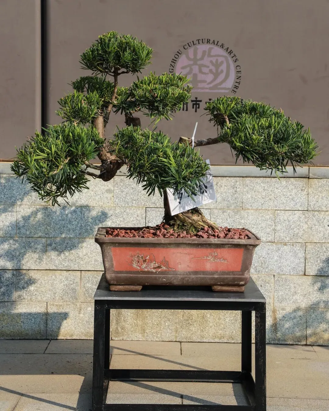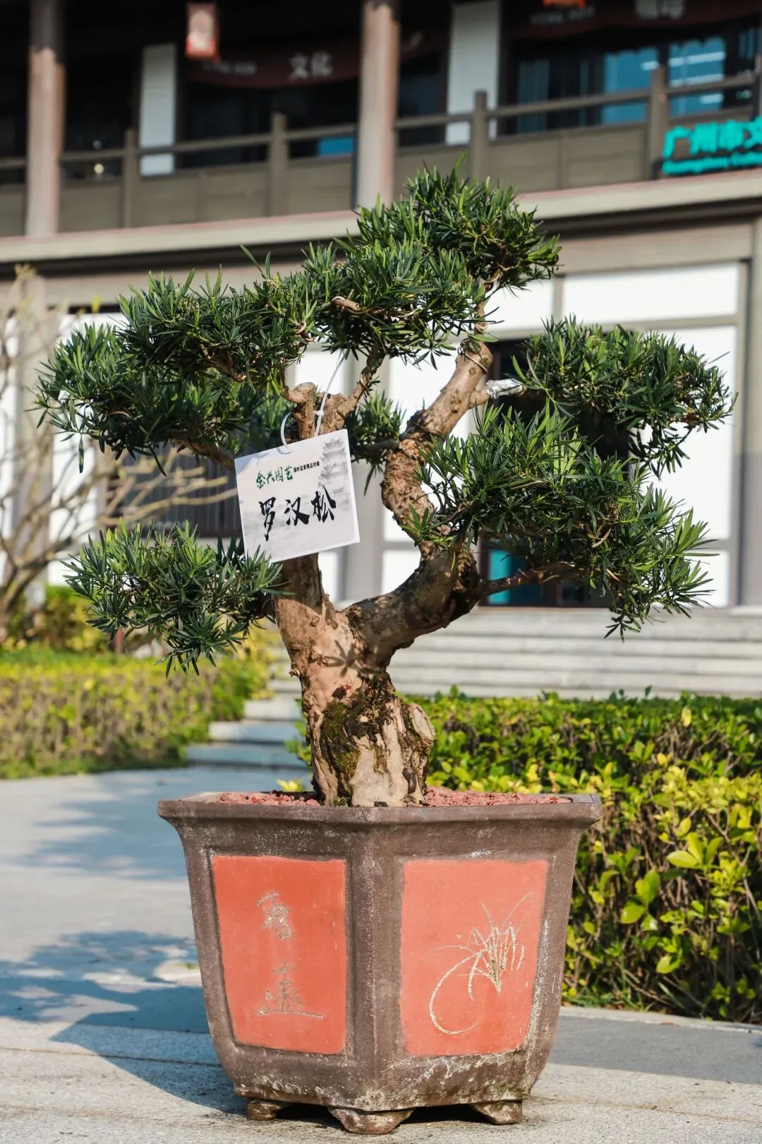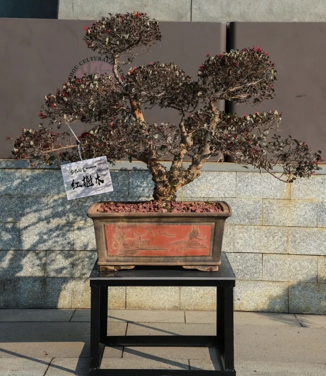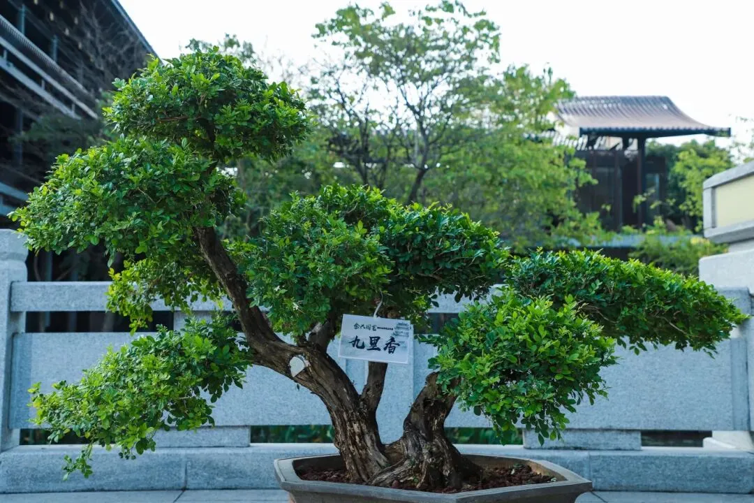 瑞岭盆景是岭南盆景的代表作之一,以“古、奇、精、秀”的艺术风格著称,以截干蓄枝为主,继承了岭南派苍劲、自然、飘逸、豪放的艺术特点。本次展览精选50盆瑞岭盆景佳作,包括九里香、罗汉松、三角梅、红檵木等品种,涵盖斜干式、揽月式、大树式、丛林式等经典造型。走进广州市文化馆千人广场,苍劲的罗汉松树干嶙峋斑驳,枝叶层叠如云,尽显百年古树的巍然气度;清雅的九里香枝叶扶疏,虽值冬日,仍仿佛能嗅到其若有似无的幽香,意境恬淡深远;灿烂的三角梅、红檵木红叶点点,在满目青翠中跳脱出一抹亮色,展现生命的热情与活力。瑞岭盆景展品错落陈列,如一幅幅被赋予了生命、意境与故事的立体画作,赏心悦目,成为广州市文化馆一道亮丽的风景线。