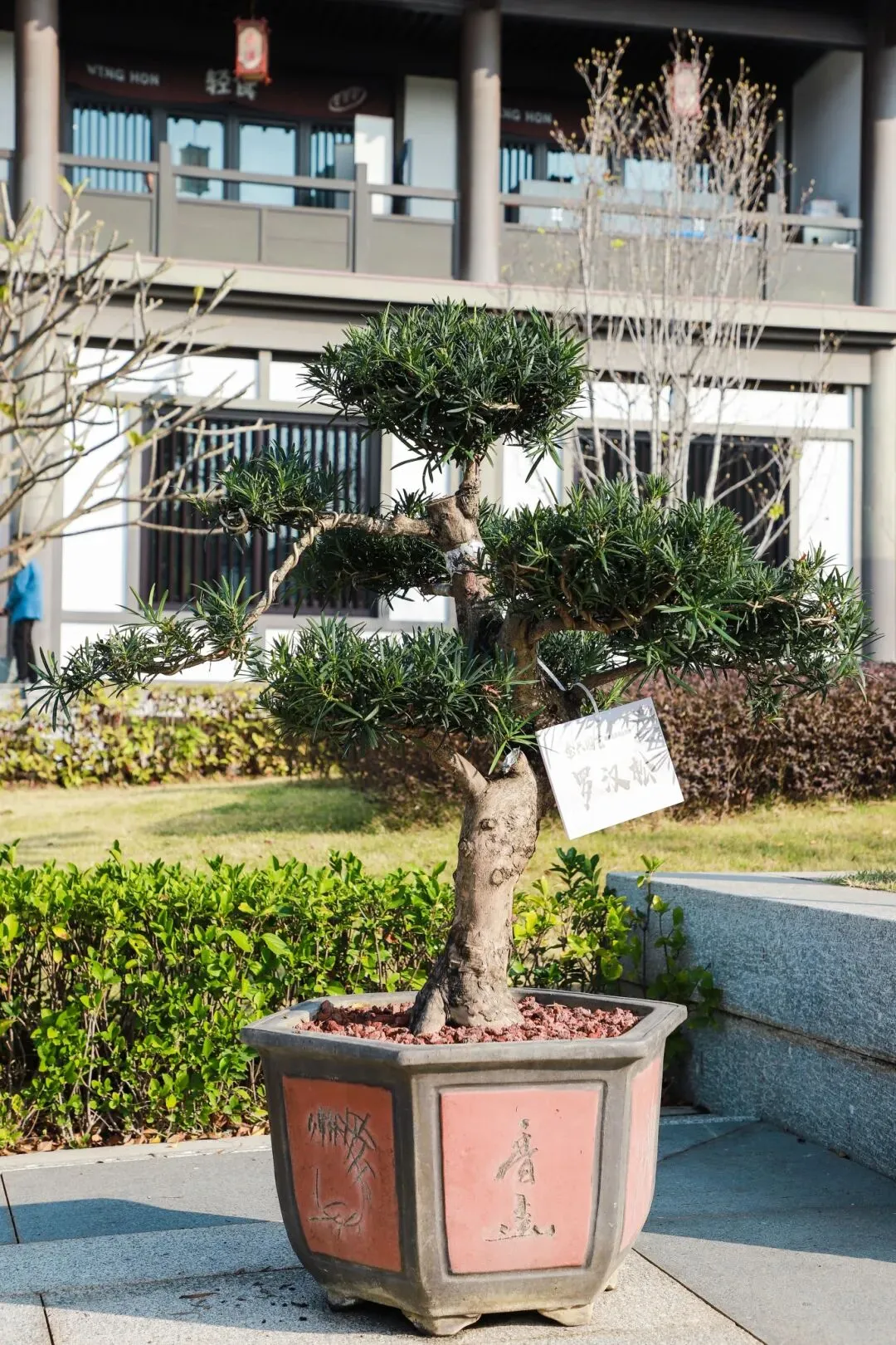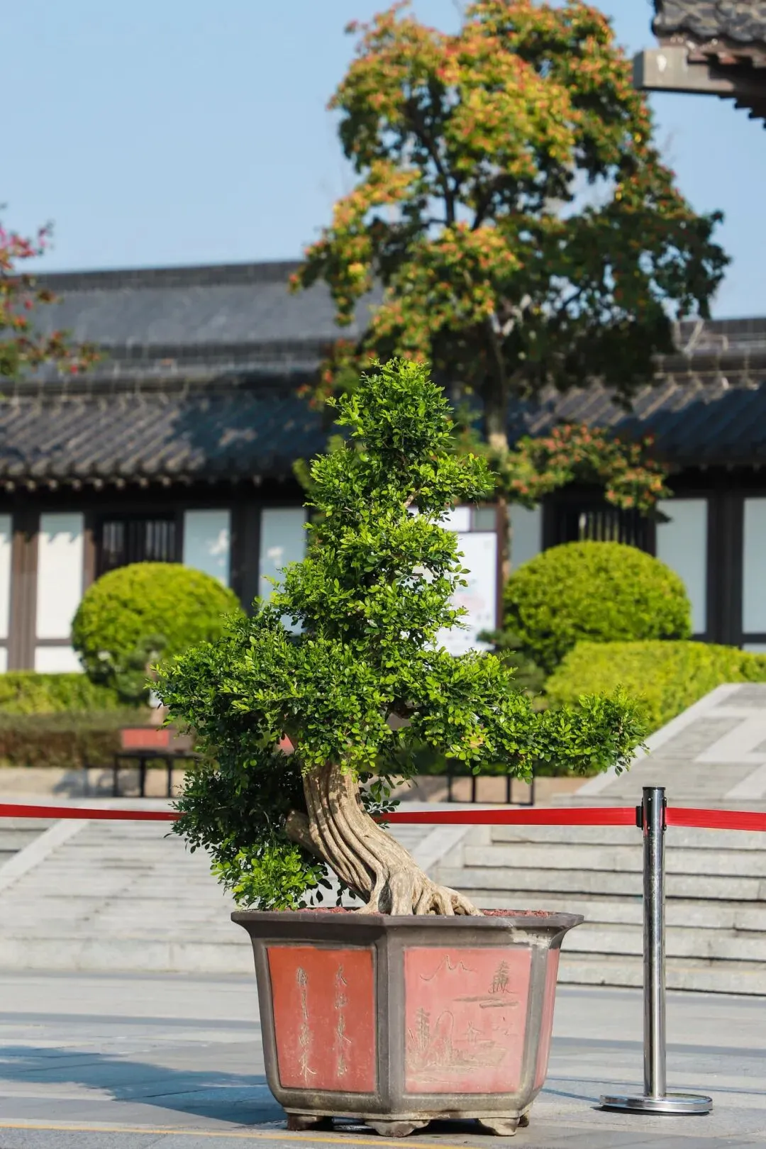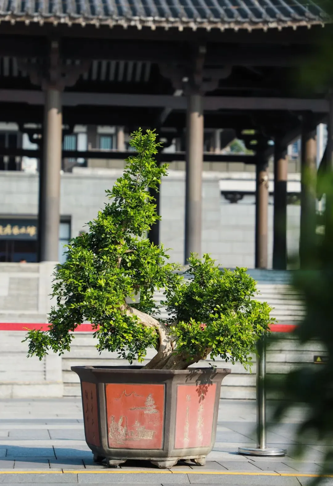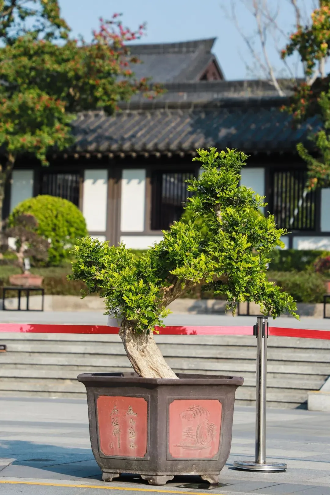 瑞岭盆景是岭南盆景的代表作之一,以“古、奇、精、秀”的艺术风格著称,以截干蓄枝为主,继承了岭南派苍劲、自然、飘逸、豪放的艺术特点。本次展览精选50盆瑞岭盆景佳作,包括九里香、罗汉松、三角梅、红檵木等品种,涵盖斜干式、揽月式、大树式、丛林式等经典造型。走进广州市文化馆千人广场,苍劲的罗汉松树干嶙峋斑驳,枝叶层叠如云,尽显百年古树的巍然气度;清雅的九里香枝叶扶疏,虽值冬日,仍仿佛能嗅到其若有似无的幽香,意境恬淡深远;灿烂的三角梅、红檵木红叶点点,在满目青翠中跳脱出一抹亮色,展现生命的热情与活力。瑞岭盆景展品错落陈列,如一幅幅被赋予了生命、意境与故事的立体画作,赏心悦目,成为广州市文化馆一道亮丽的风景线。