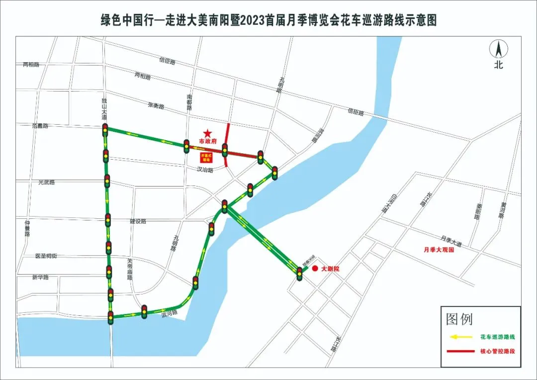 巡游路线:三馆一院(大剧院西广场出发)→光武大道→光武大桥→滨河大道→范蠡路→独山大道→滨河大道→光武大桥→光武大道→三馆一院(大剧院)