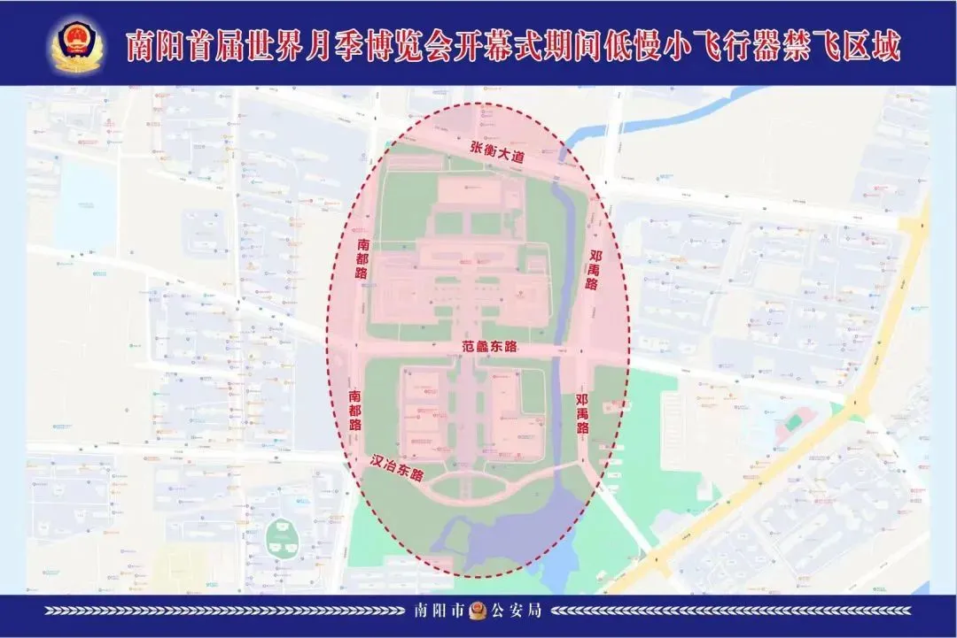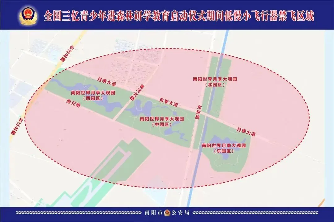 禁飞区域:南阳世界月季大观园(中园区)东西半径3公里、南北半径2公里