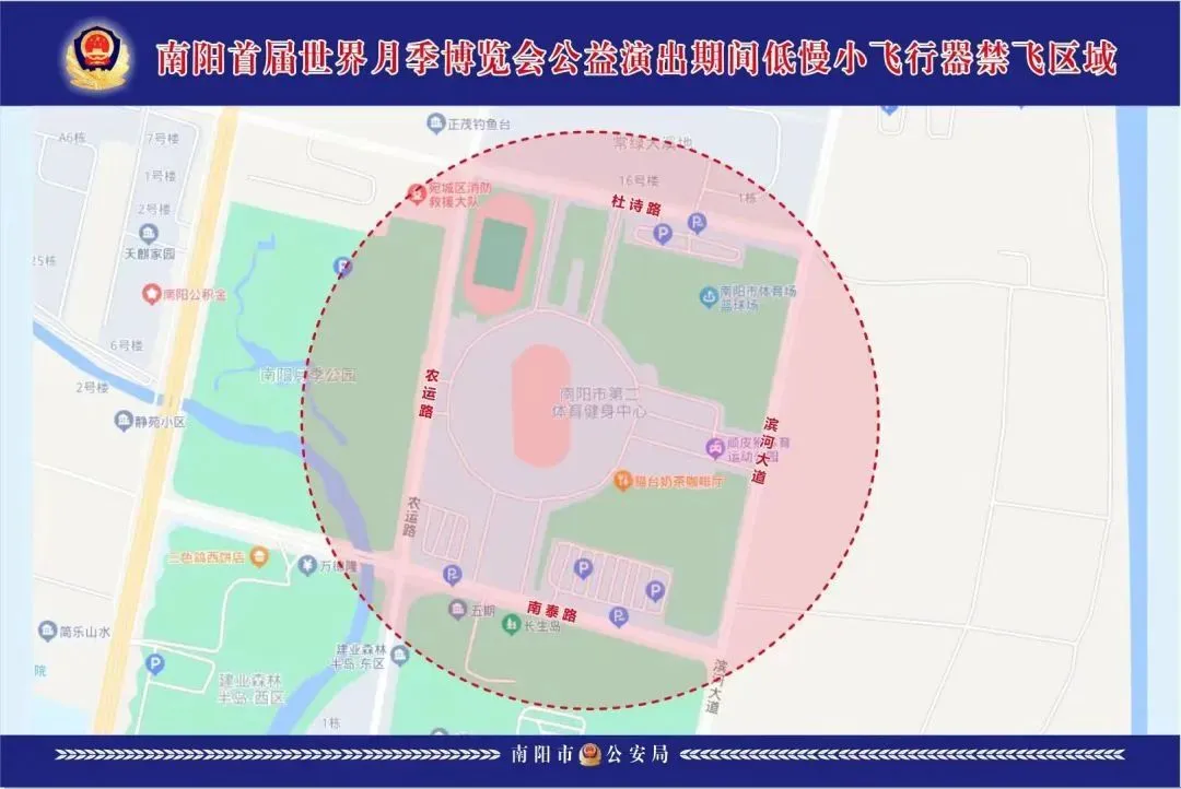禁飞区域:南阳市第二体育健身中心(鸟巢体育场)周边半径2公里