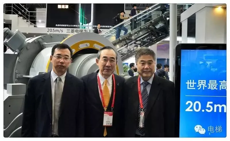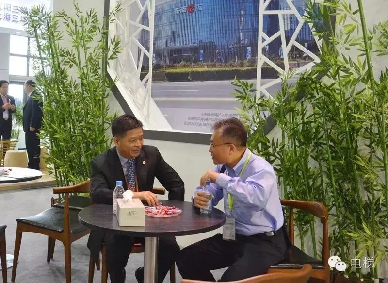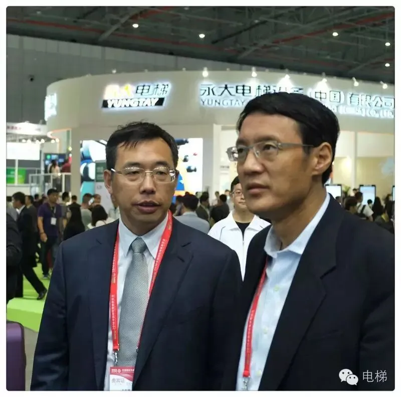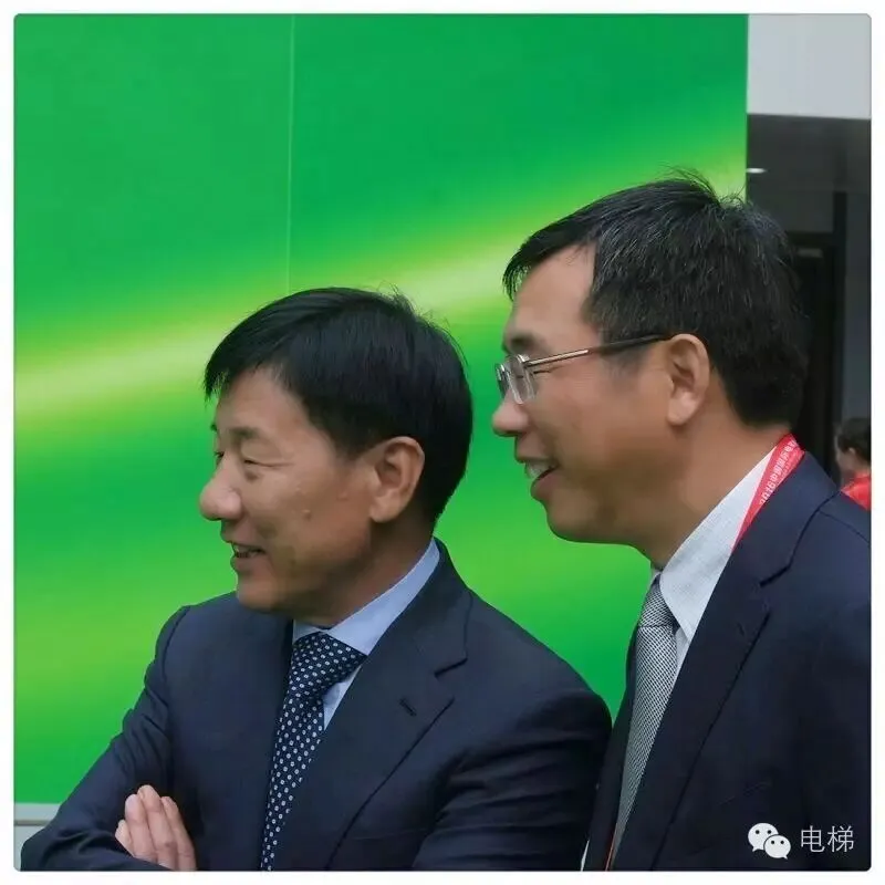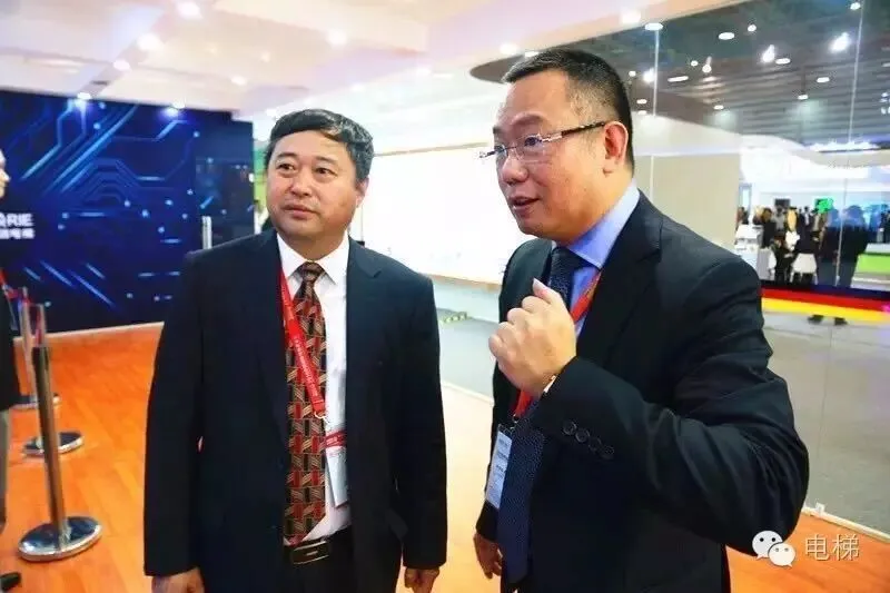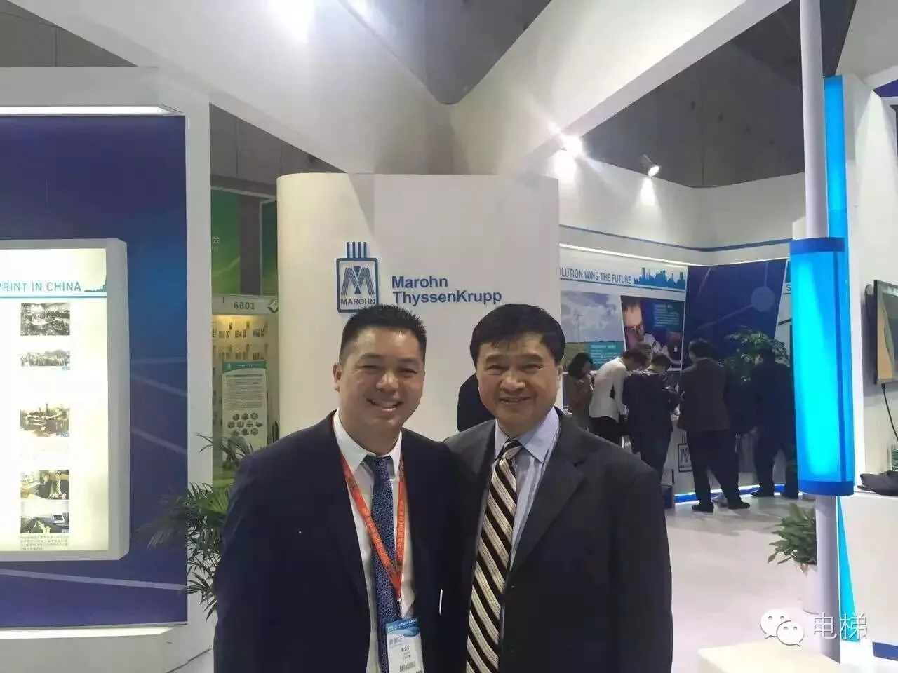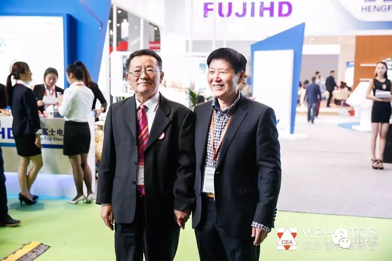 宁波申菱电梯配件有限公司董事长卢国平(左)与上海三菱电梯有限公司总裁万忠培(右),图意:这届电梯展会来的人真多,好开心!